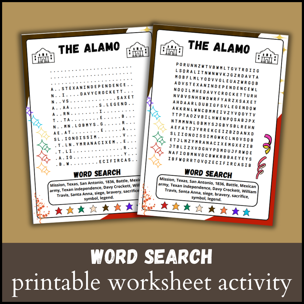 Featuring words related to the Alamo, such as “Davy Crockett,” “Texas Revolution,” and “Mission San Antonio de Valero,” this word search is both educational and entertaining. Challenge yourself to find all the hidden words while uncovering fascinating tidbits about this iconic landmark.