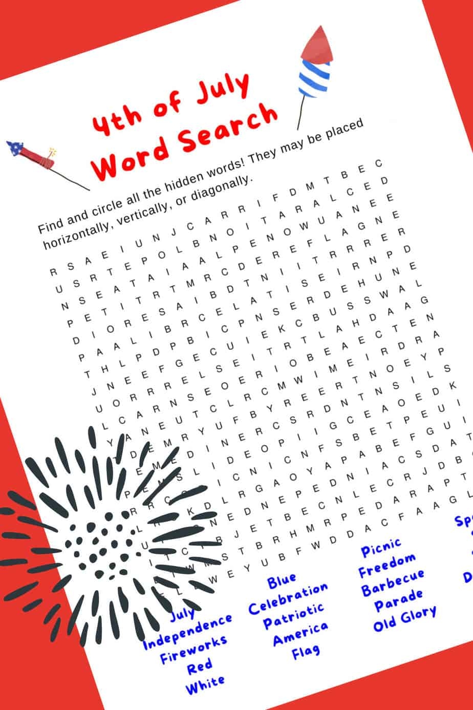 This Fourth of July word search printable features a mix of words related to Independence Day, such as fireworks, barbecue, flags, and more. It’s a great way to get into the patriotic spirit and have some fun at the same time.