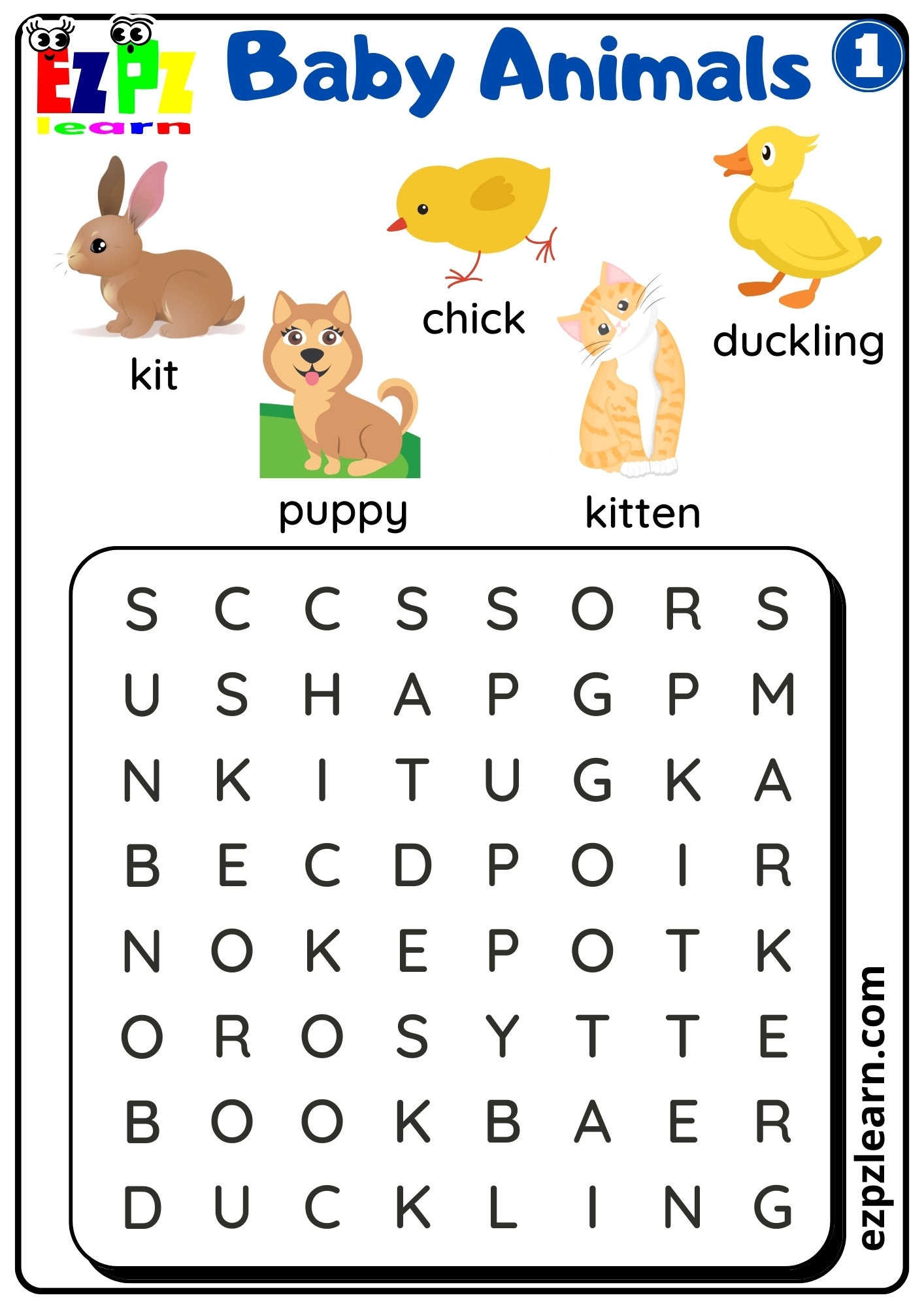 Baby Animals Word Search Worksheet For English Language Learners And Kindergarten Students Free Download Ezpzlearn