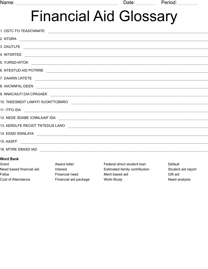 Financial Aid Glossary Word Scramble WordMint