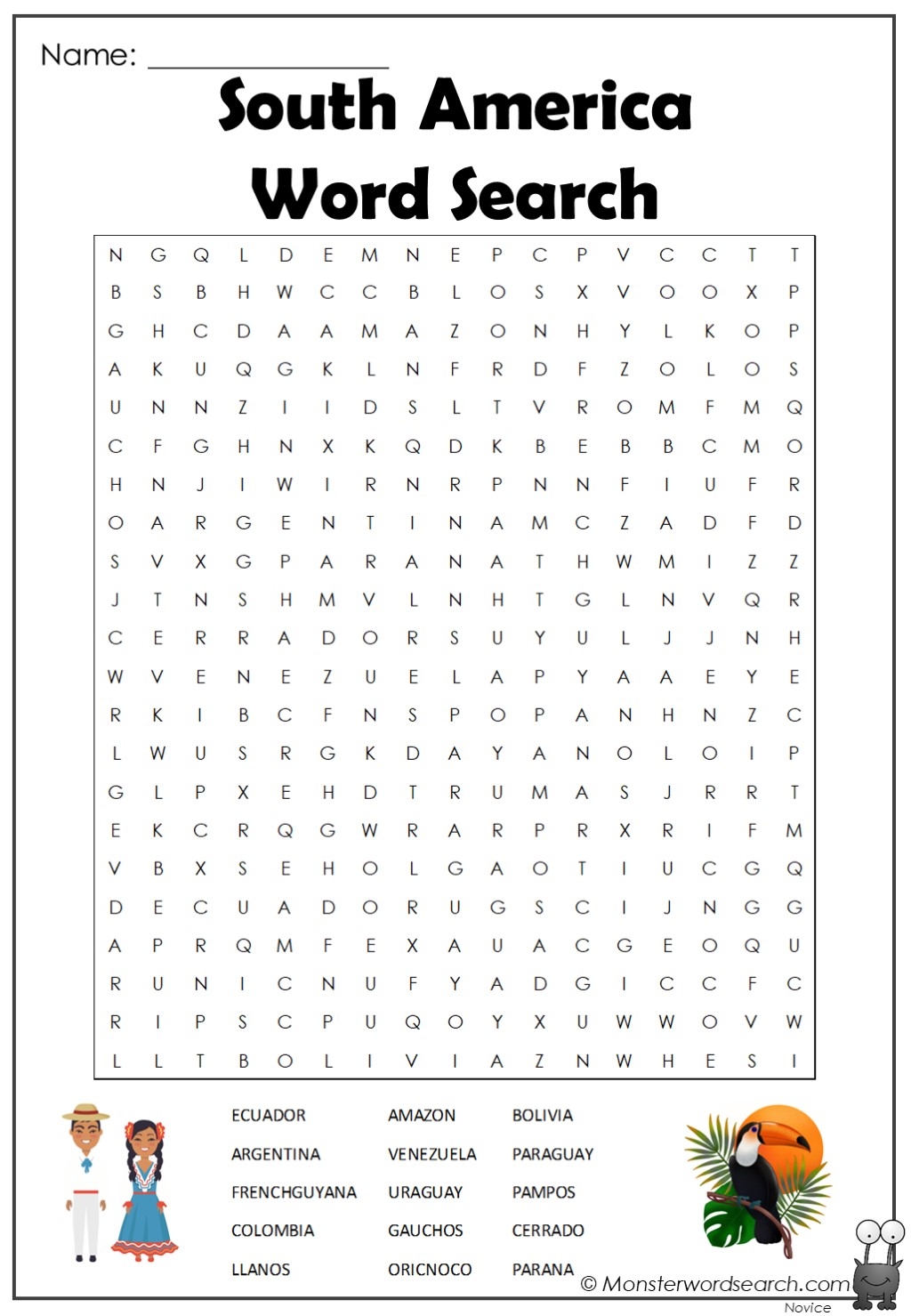 South America Word Search Monster Word Search