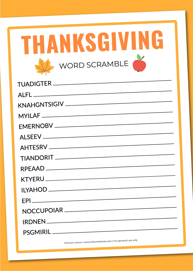 Printable Thanksgiving Word Scramble Chevron Lemon