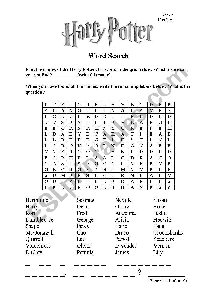 Harry Potter Word Search ESL Worksheet By Srhlsprsh
