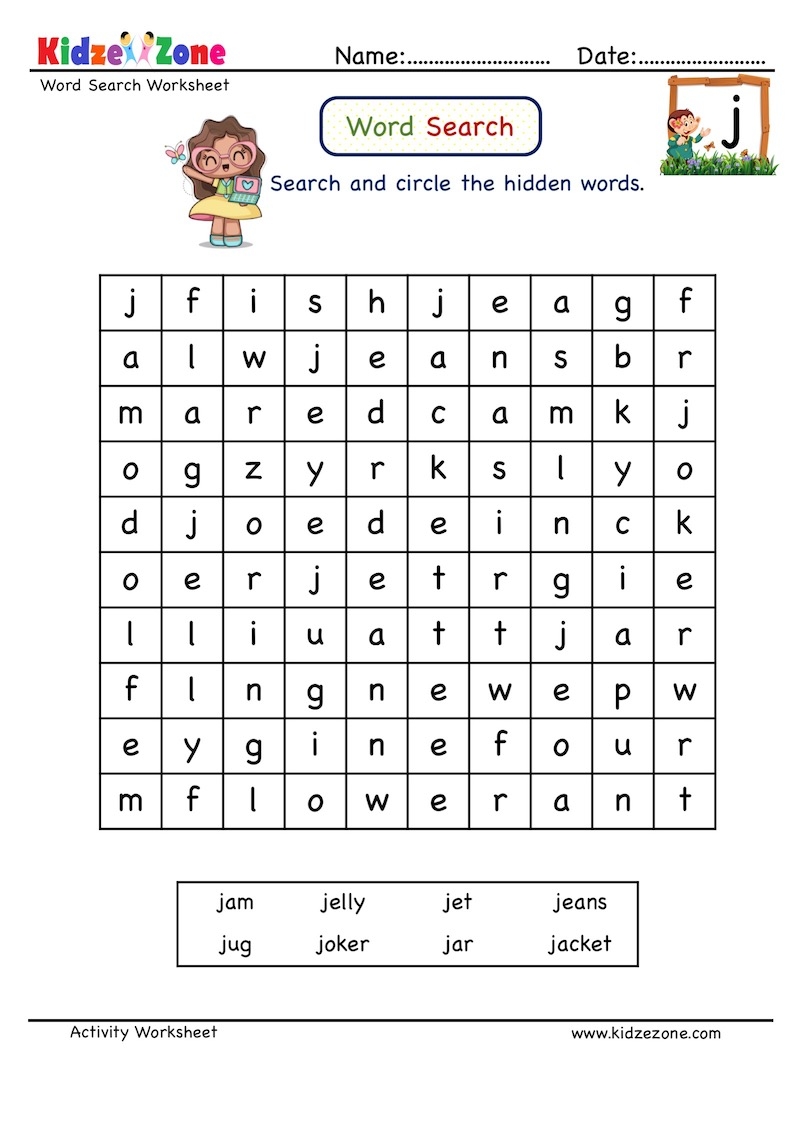 Letter J Word Search Grid Worksheet KidzeZone