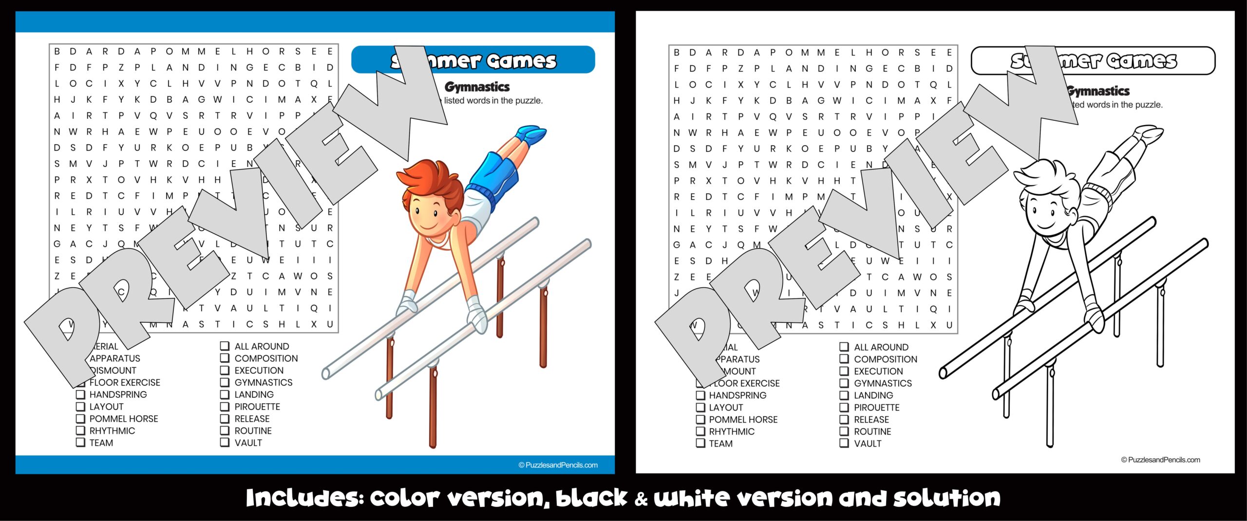 You’ll find words like “beam,” “vault,” “floor,” “leotard,” and many more. Challenge yourself to find all the words as quickly as possible, or take your time and enjoy the process.