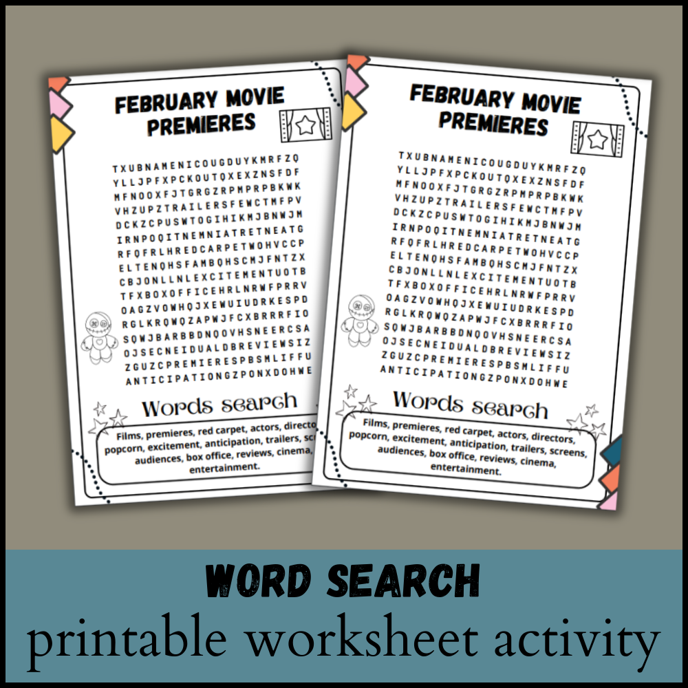 February Movie Premieres Word Search Puzzle Worksheet Activity Made By Teachers