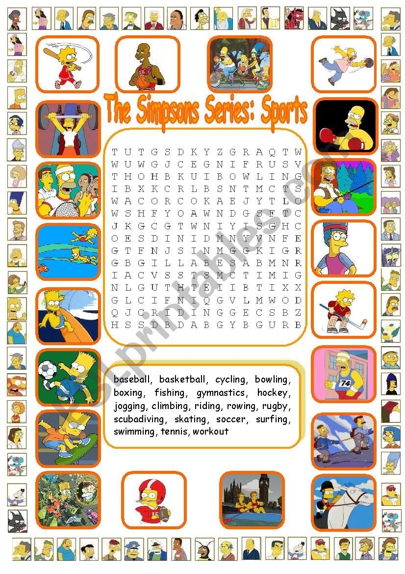 The Simpsons Series Sports Wordsearch WITH KEY ESL Worksheet By Ceballos