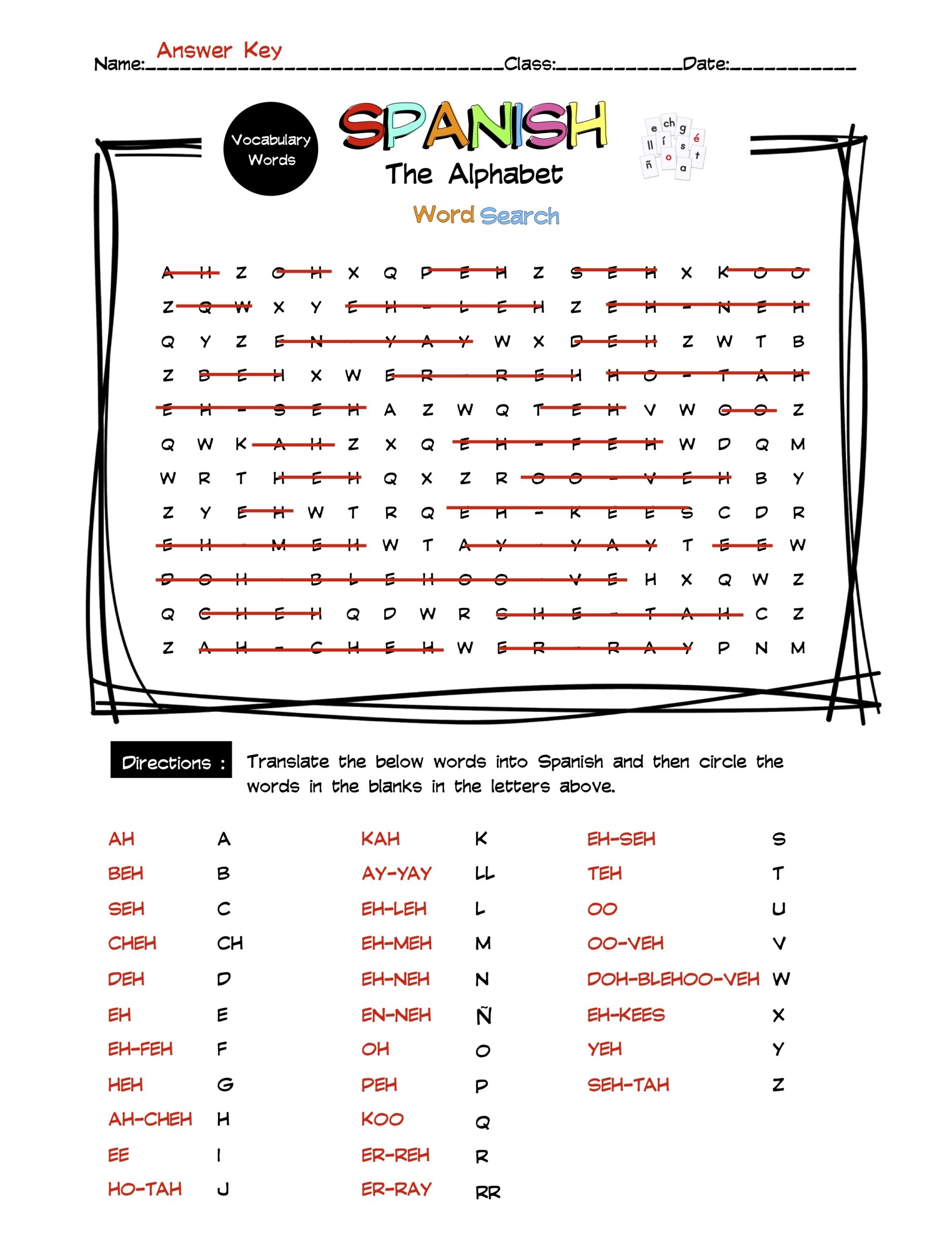 Spanish Alphabet Vocabulary Word Search Worksheet Answer Key Made By Teachers