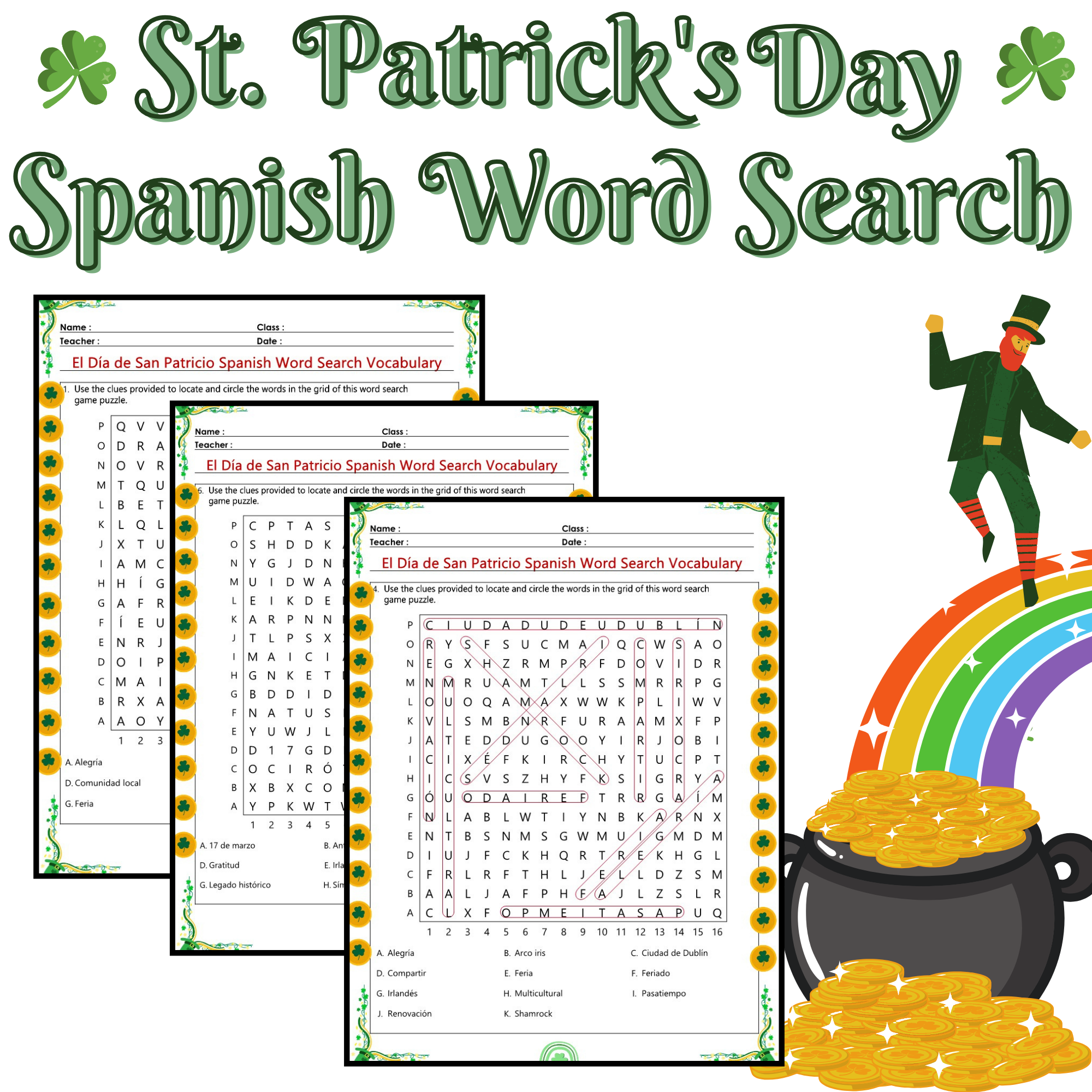 St Patrick s Day Spanish Word Search Bundle Of 7 Puzzles With Answers No Prep Vocabulary Activity El D a De San Patricio Classful