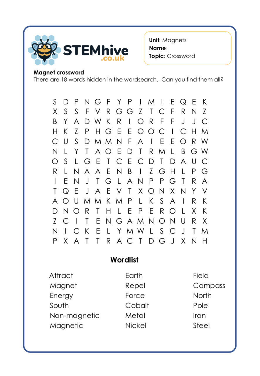 In this word search puzzle, you’ll find a variety of words related to magnetism, including terms like “north pole,” “magnetic field,” “ferromagnetic,” and more. As you search for each word in the grid, you’ll learn interesting facts about magnets and how they work.