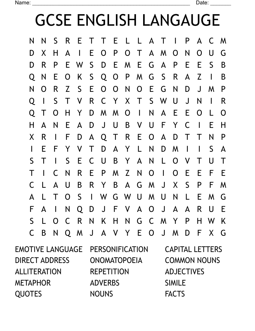 GCSE ENGLISH LANGAUGE Word Search WordMint