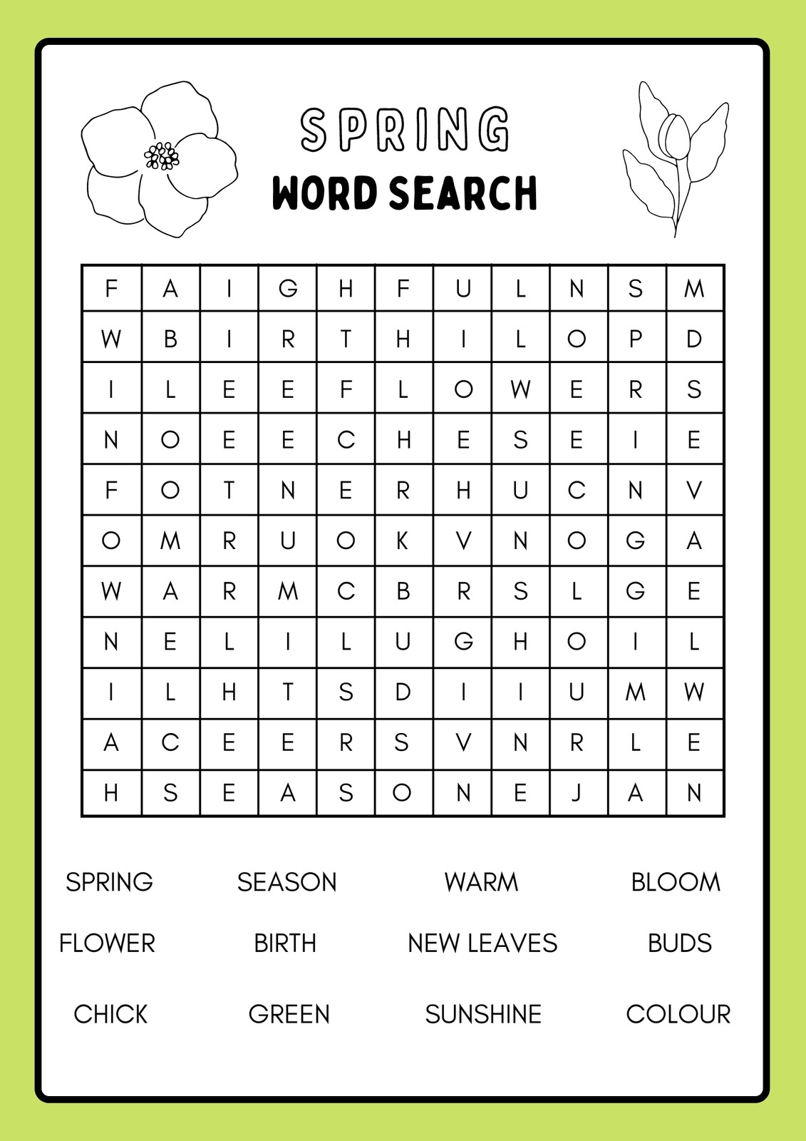 Word searches are a classic favorite for kids of all ages. They encourage focus, attention to detail, and problem-solving skills. With spring-themed word searches, children can learn about the season’s unique characteristics while having a blast searching for hidden words.