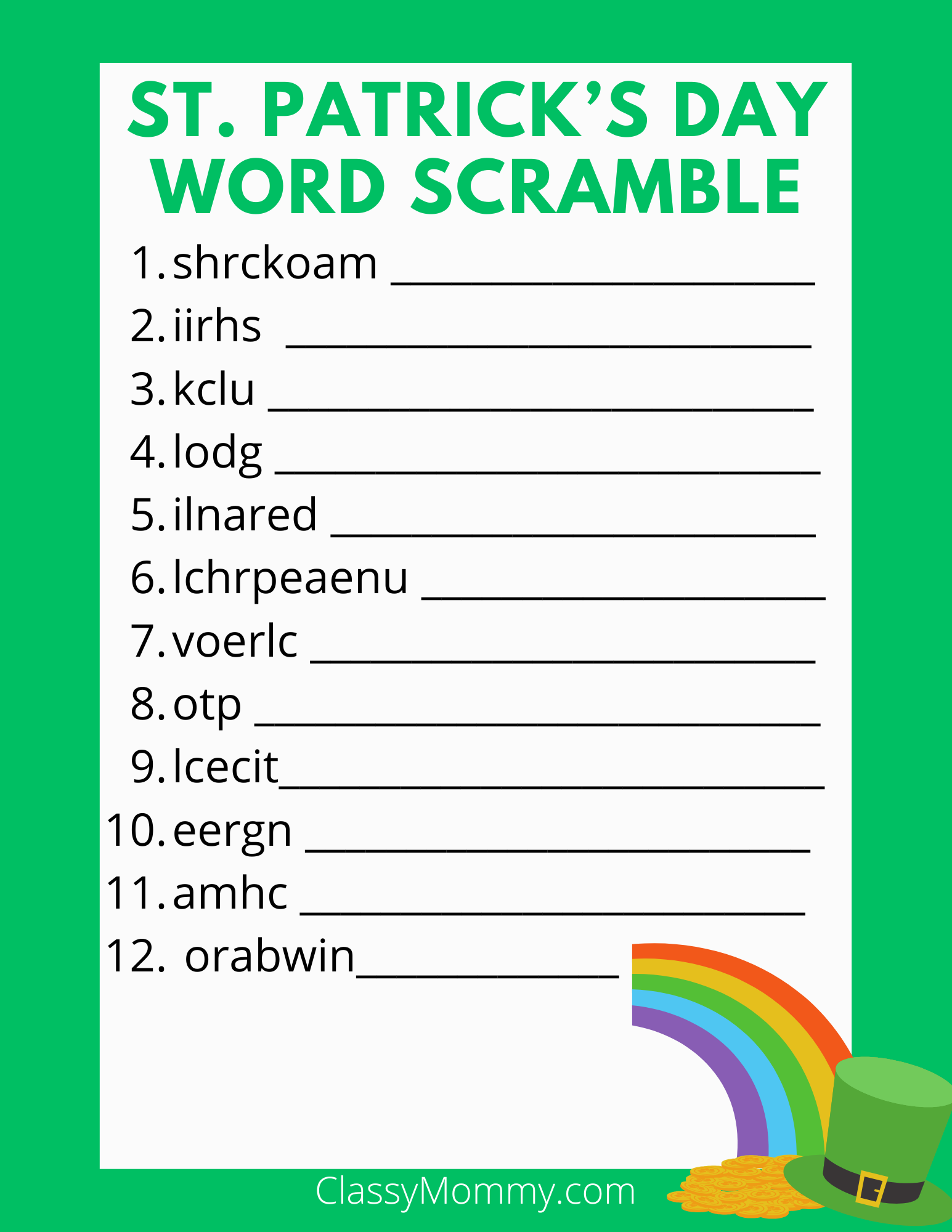 Easy Free Printable St Patrick s Day Word Scramble Classy Mommy