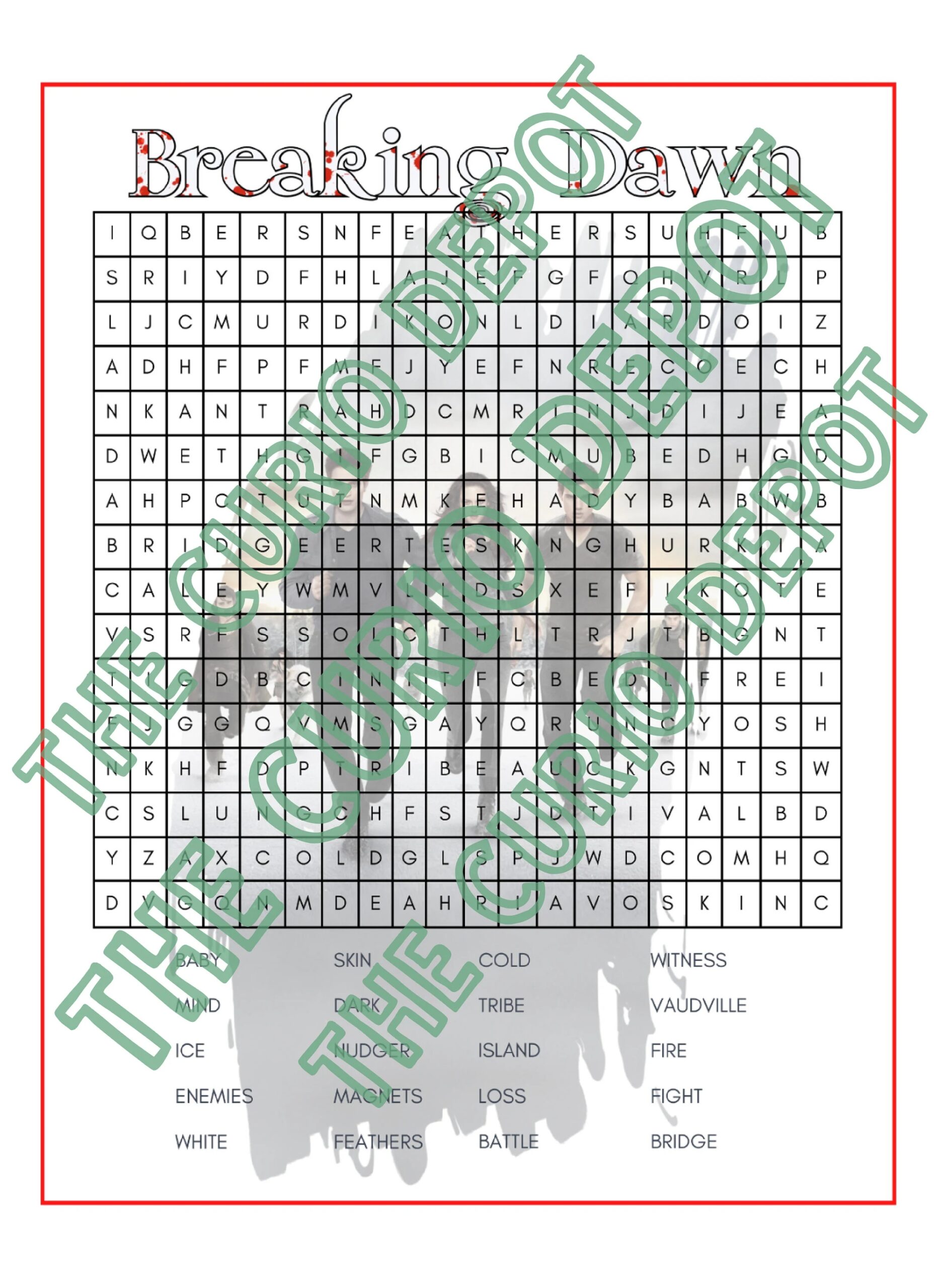 With words like Bella, Edward, vampire, werewolf, and Forks, this word search is sure to bring back all the feels from the Twilight saga. Challenge yourself to find all the hidden words and see how fast you can complete it!