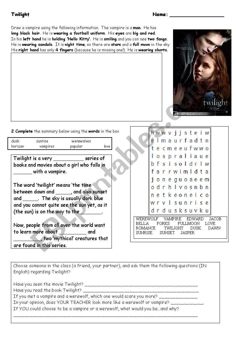 Twilight Reading Drawing Partner Interview and A Word Search ESL Worksheet By Teachergary