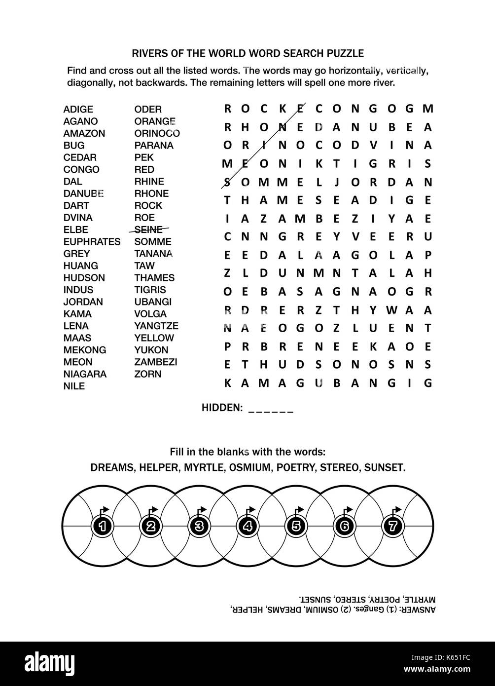 Puzzle Page With Two Word Games English Language Rivers Of The World Word Search Puzzle And Fill The Wheels Black And White Stock Vector Image Art Alamy