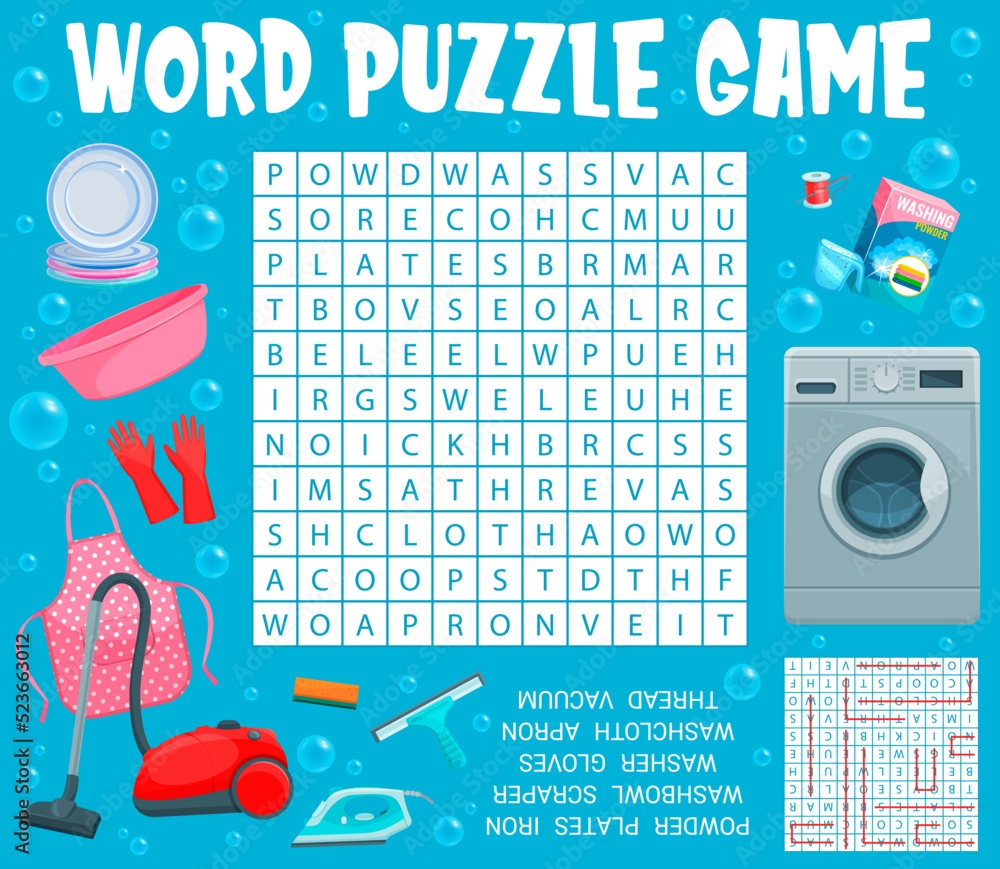 Cleaning And Washing Word Search Puzzle Game Vector Worksheet Vector Kids Quiz Grid Puzzle Or Riddle To Find Word Of Laundry Powder Washing Machine Or Vacuum Cleaner And Iron With Apron Stock