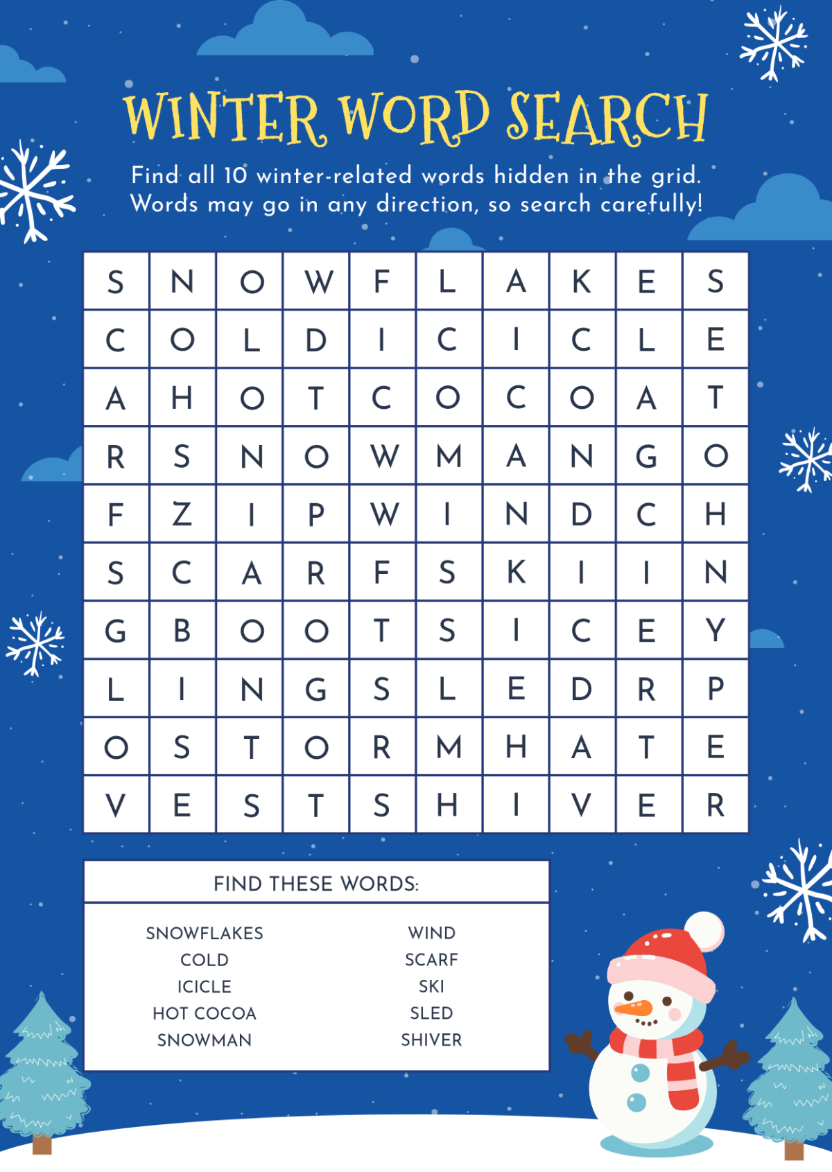 Whether you’re a fan of snowflakes, hot cocoa, or winter sports, there’s a winter word search out there for you. With words like “snowman,” “mittens,” and “ice skating,” you’ll be sure to get into the winter spirit in no time.