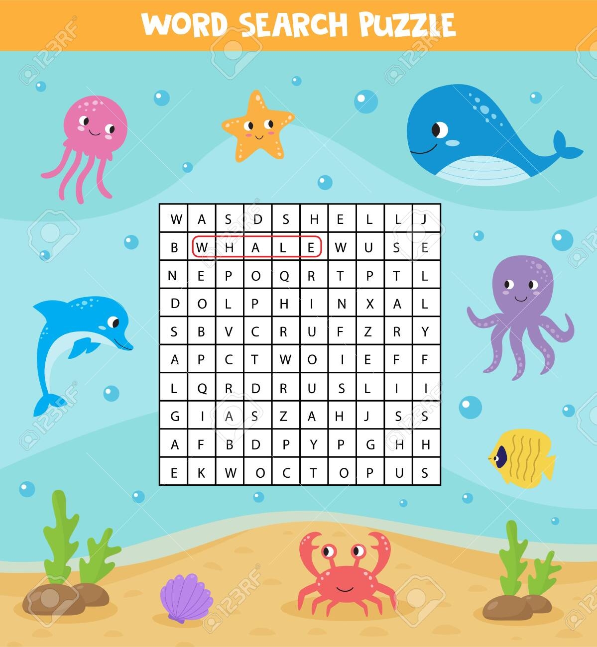 Words Search Puzzle For Kids Sea Animals Find The Words In Field Printable Material Elementary Crossword For Children Royalty Free SVG Cliparts Vectors And Stock Illustration Image 145234929