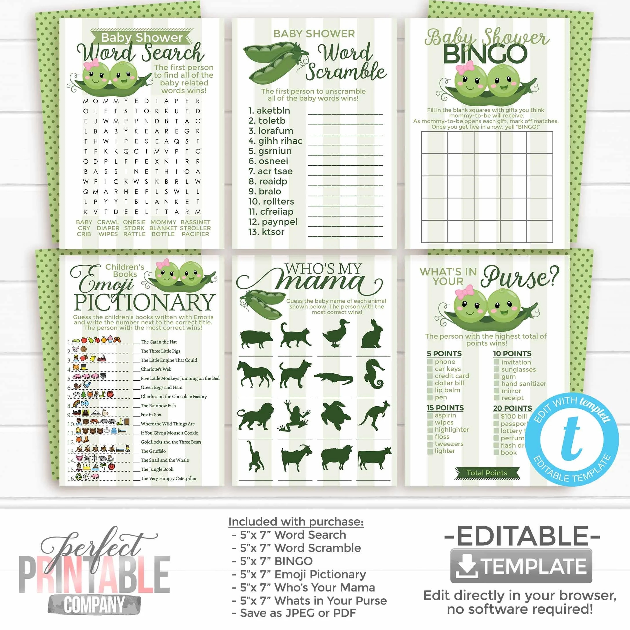 Two Peas In A Pod Baby Shower Games Twin Boy And Girl Emoji Pictionary Word Search Scramble BINGO Baby Name Whats In Your Purse 752 Etsy