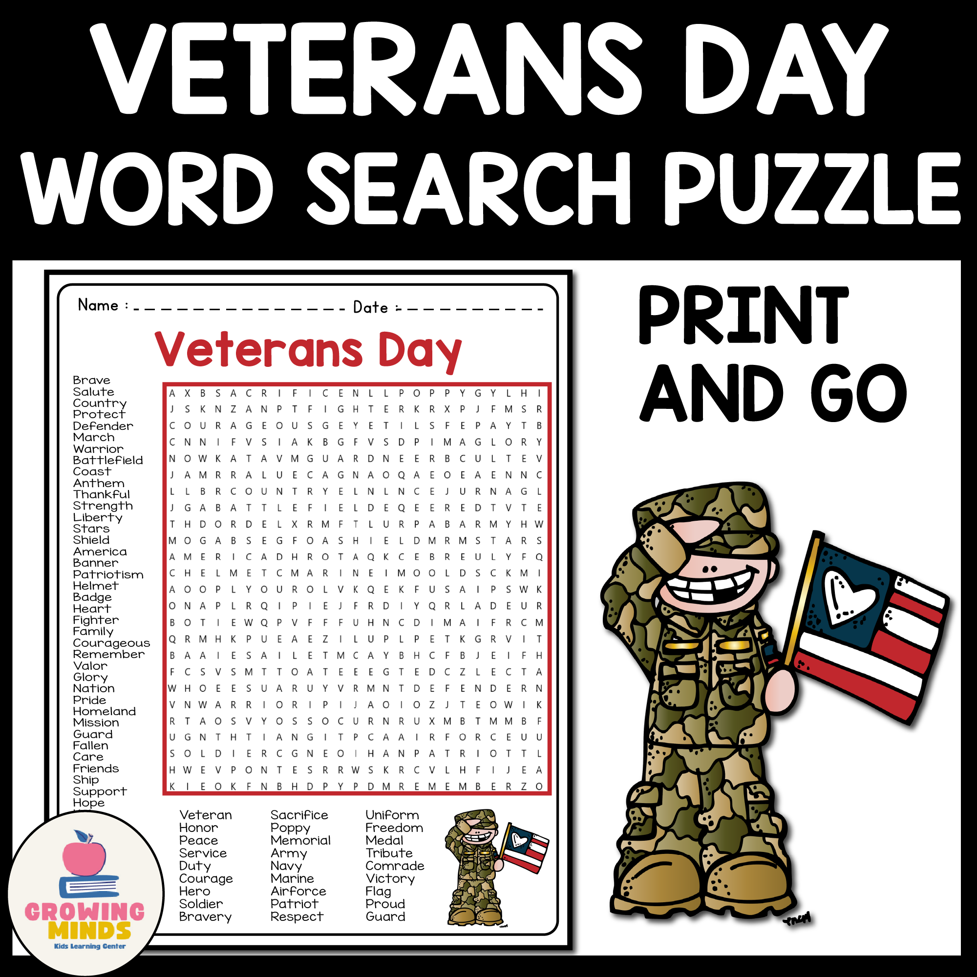 This printable puzzle is perfect for kids and adults alike. It features words related to Veterans Day, such as “freedom,” “service,” “honor,” and more. It’s a great way to test your knowledge and learn new facts about this important holiday.